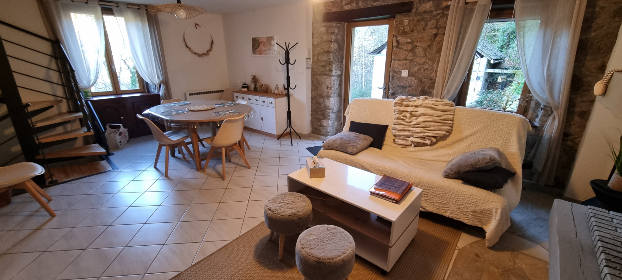 Sur les hauteurs d'Entraygues, Petit ensemble immobilier en pierres avec terrain attenant. Il se compose d'une maison, grange et 2 autres petites dépendances en pierres. La maison a été entièrement refaite en 2019 : charpente, toiture, isolation, chauffage, électricité, carrelage, cuisine .... Elle se compose de 3 niveaux aménagés , au rez de chaussée une cuisine equipée avec coin repas et buanderie/rangement à l'arrière, au niveau intermédiaire une grande salle à manger de presque 30 m² avec cheminée, et un coin avec wc et douche, en combles 2 chambres. L'intérieur est trés bon état, la décoration est soignée. L'ensemble des meubles est vendu avec la maison. En face de la maison se trouve la grange/étable offrant une garage au rez de chaussée et environ 25 m² de grange au dessus. Cet ensemble immobilier est disposé au bord d'une petite route peu fréquentée. L'ensemble dispose d'une petite cour fermée entre les deux bâtiments L'environnement est trés boisé, le reste du terrain est pentu.
