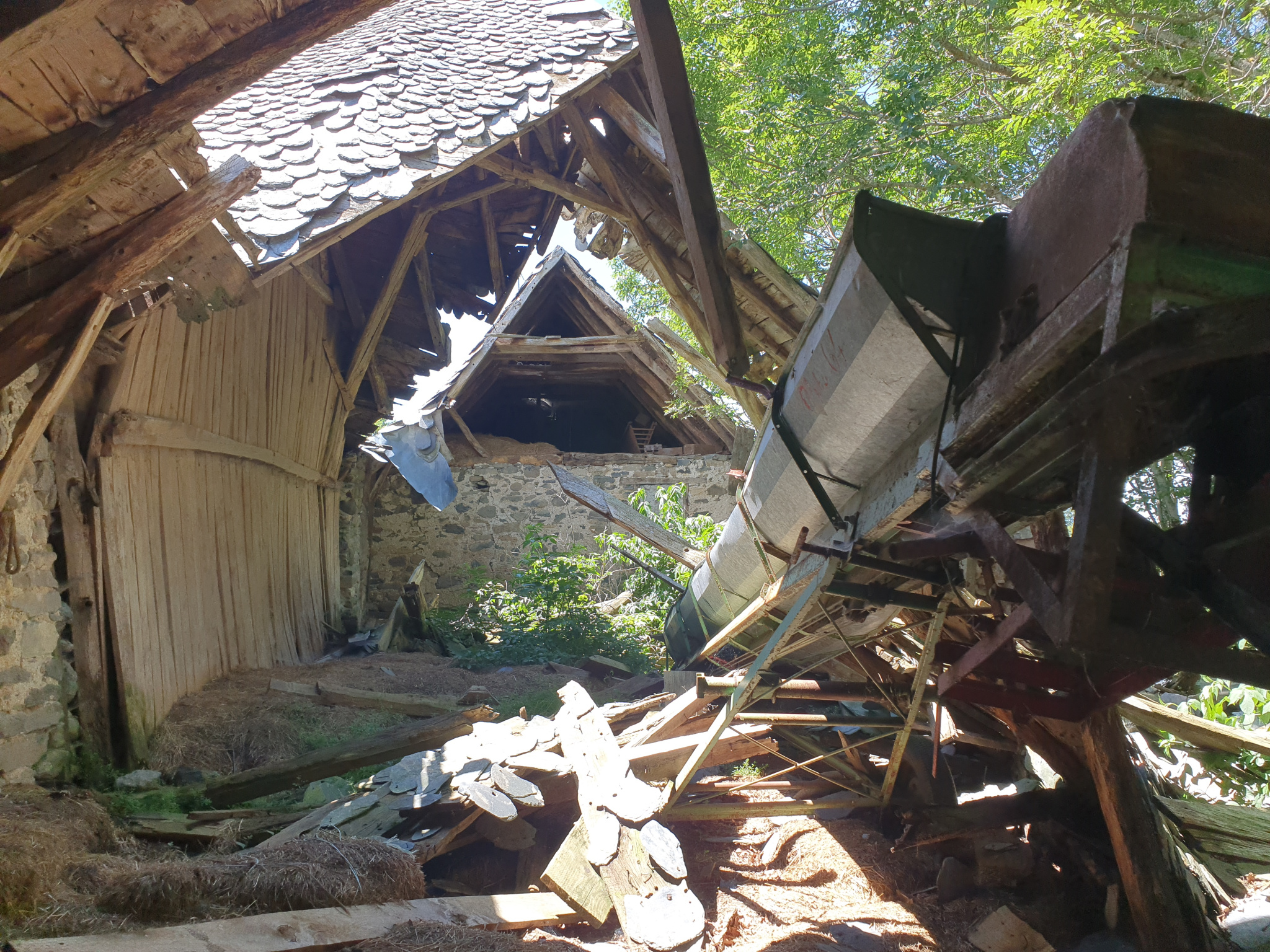 Bâtiments en pierres autour d'une cour fermée, comprenant : une maison sur 2 niveaux (cuisine, arrière cuisine, cave, séjour, 3 chambres, WC et débarras) + grange-étable + appentis + ruines d'une ancienne grange-étable au dos de la maison.